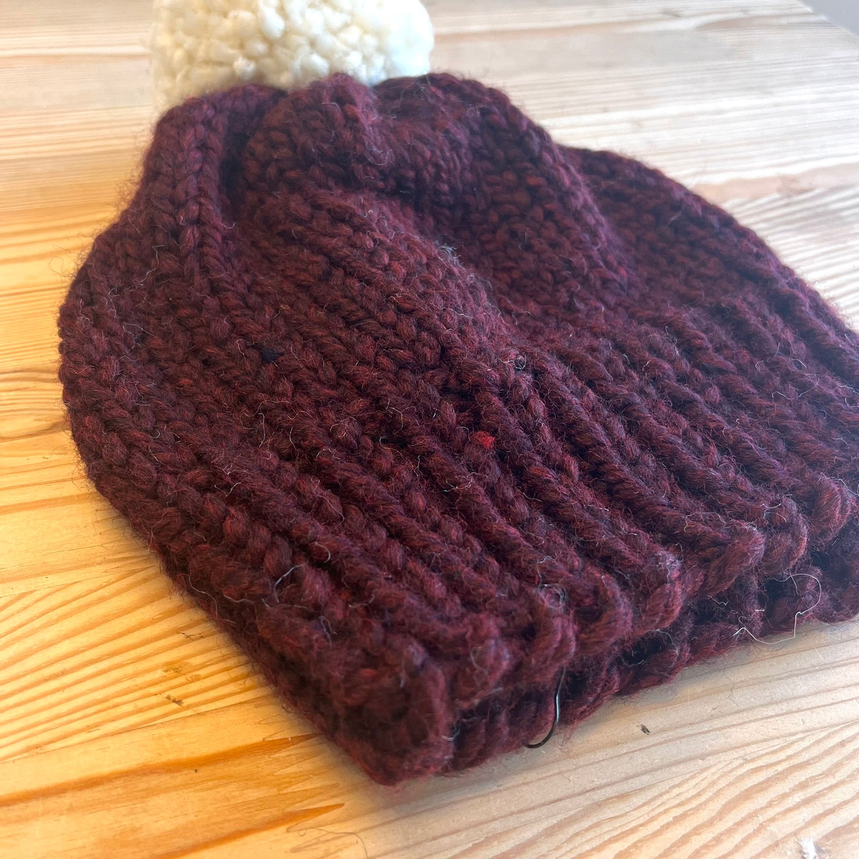Chunky knit slouchy simple handmade seamless white pom pom beanie hat.