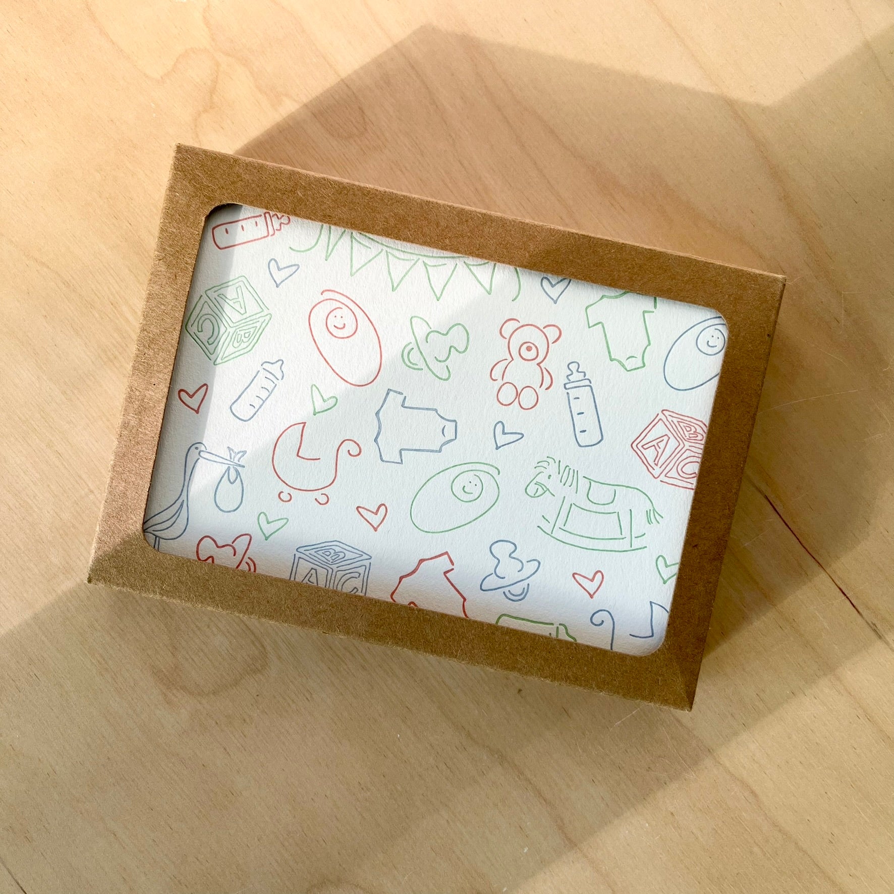 A set of 6 notecards with coordinating envelopes. These make great thank-you cards for baby showers!