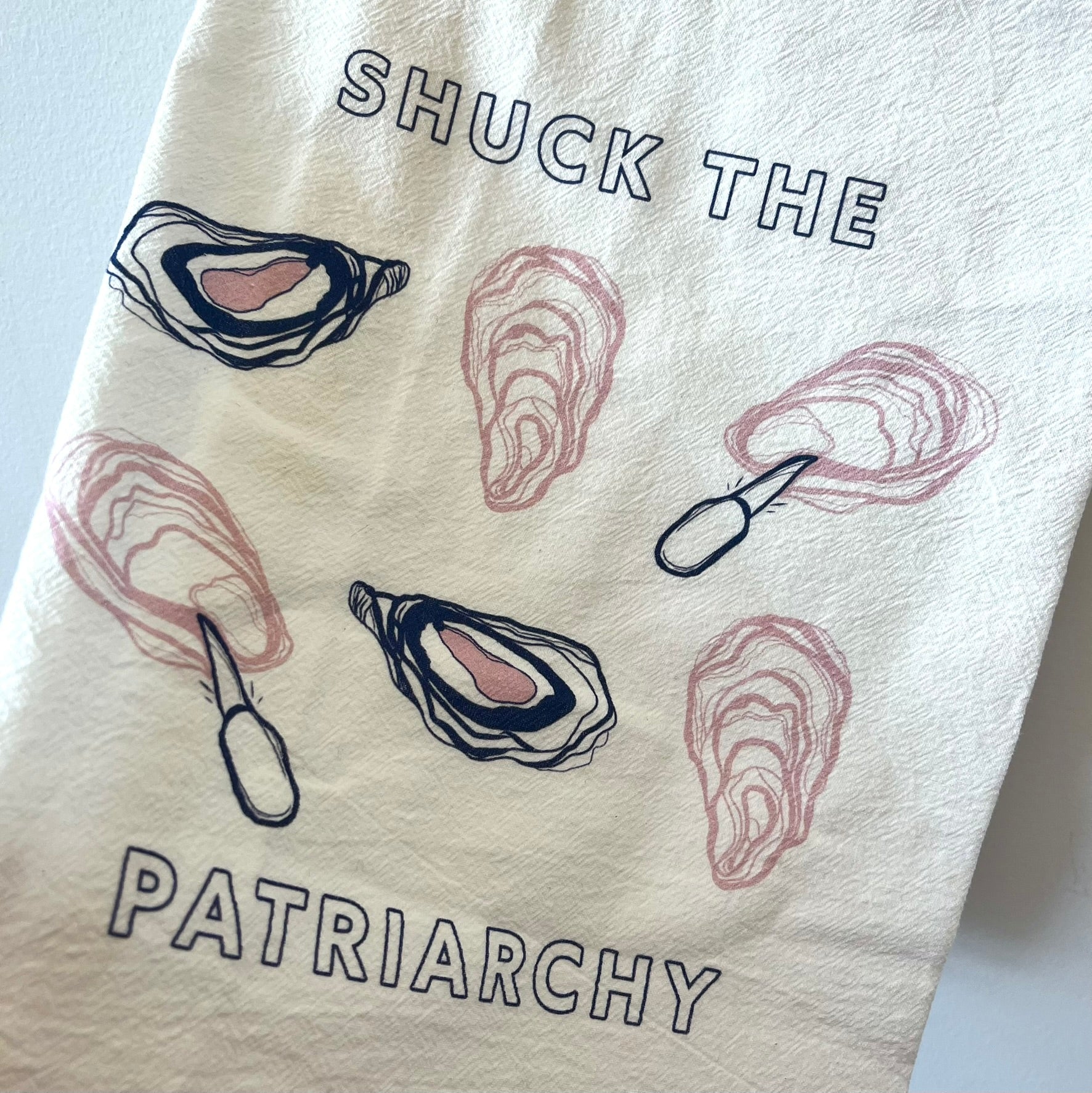 Display this oyster-inspired tea towel and say "Shuck You" to the patriarchy. This white cotton tea towel is super versatile!
